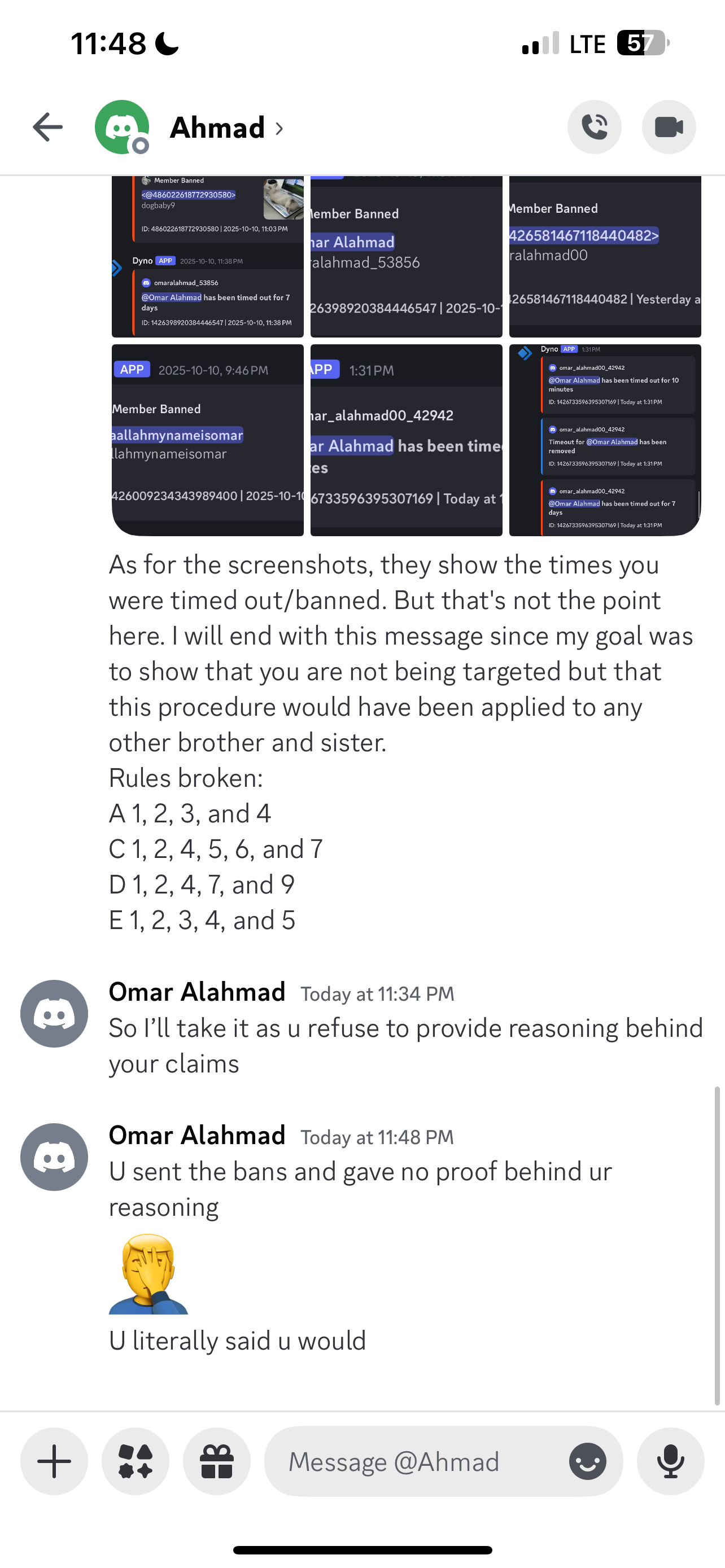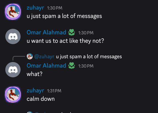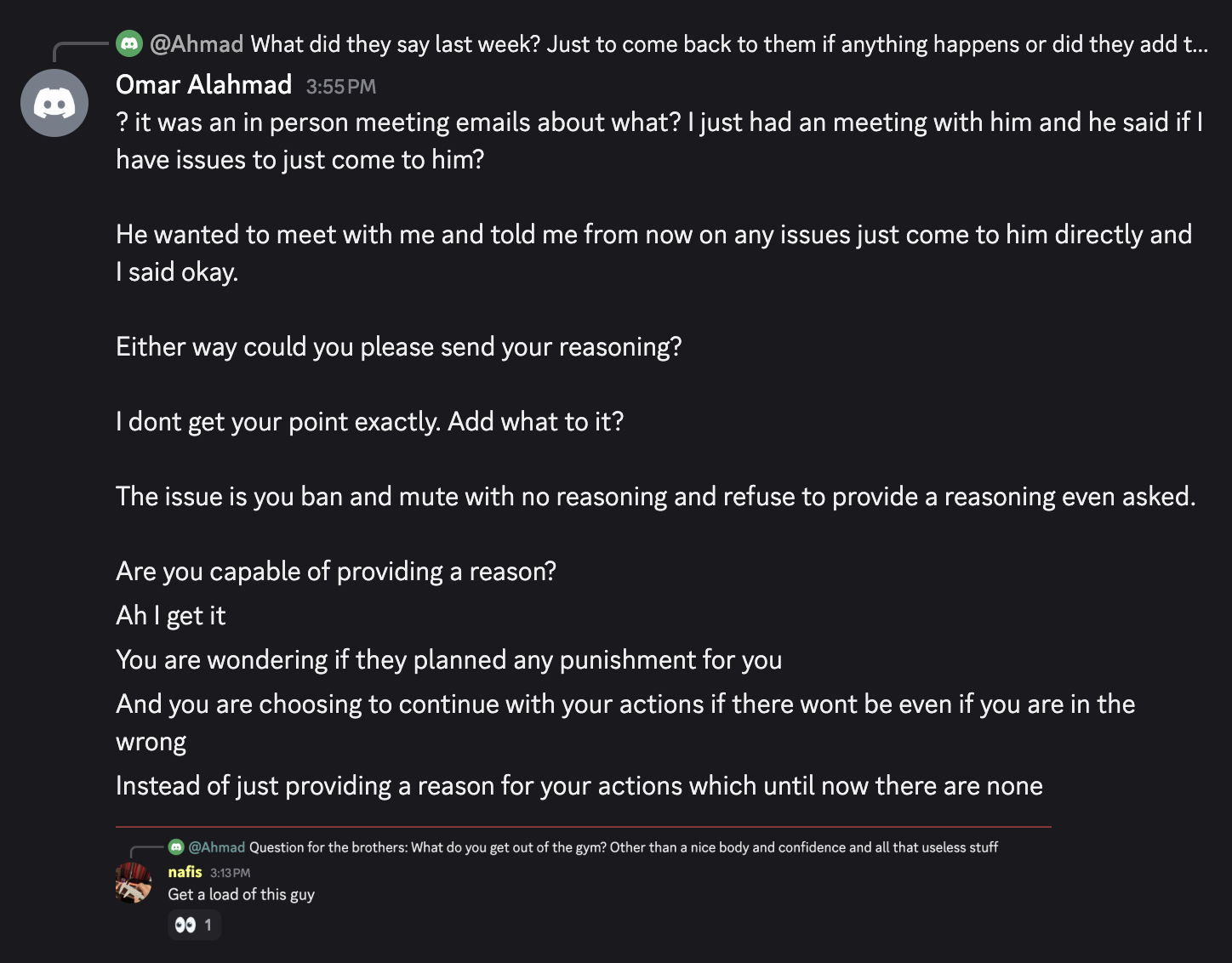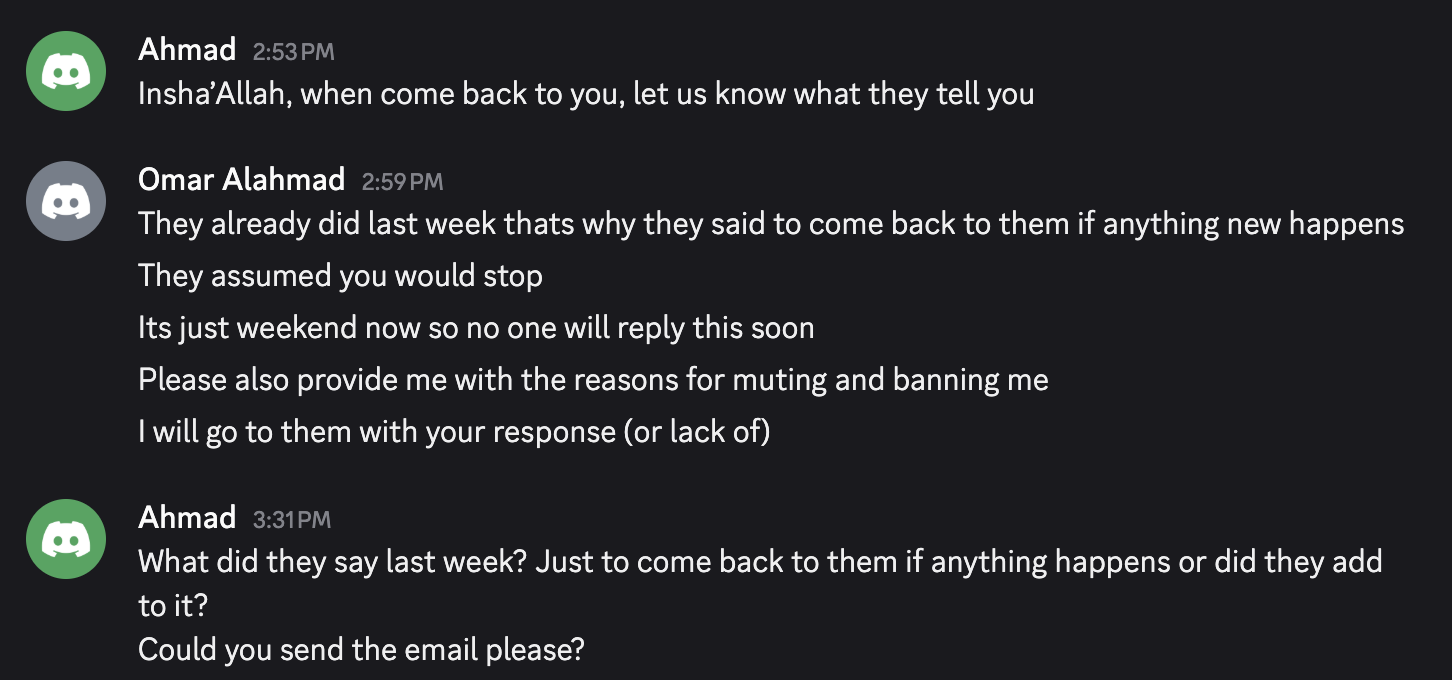 I don’t remember you asking multiple times. I see this is the first time you have asked me. I personally texted your second account, your alt account, and you did not respond. My colleagues also texted you on other accounts of yours. They said you did not answer either. So the fact that you are asking multiple times about reasoning, that’s the first time for me. You asked two or three times today but that’s because I did not answer this morning. I was a bit busy. I saw your email to the university saying you asked multiple times. Look, I don’t remember the multiple times, but taking it all the way to the university is really, in my opinion, nonsense. Lastly, if you like debates so much, then just say it straightforwardly. People usually don’t debate. But if you like to, just say, “I like to argue, I like to debate, I like to go back and forth.” That way we know what is happening. I see you have a website for debates. Just say it clearly, “Hey guys, I like debates, let’s debate.” Be straightforward, because people see it as disrespectful to come up and argue without them knowing this is what you like to do between brothers. Otherwise, it looks like a random person joined the server and started arguing.
