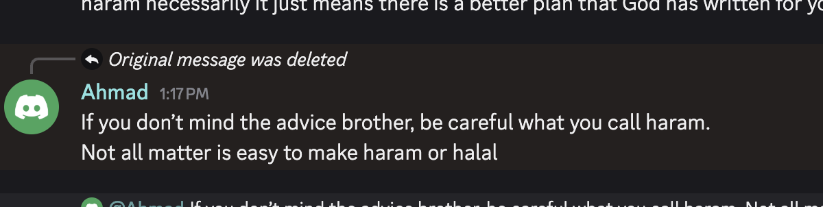Now, the fact that you’re bringing this up all the way to university is very, it puts a very bad image again, a second time, on the MSA. Not only have you disrespected the MSA on Discord and social media, but you have also disrespected the MSA on the internet, on a web page that either you or your friend have created, and you have posted on it that the MSA is holding something haram. You try to argue it, and so on. Both things are very disrespectful and put a bad image on the MSA. I have asked you very respectfully to take it out, and you have also put my name on it, which I do not agree with. You say you don’t need my permission. No worries, but it’s a matter of respect, of being respectful to each other, especially as brothers in Islam. Also try not to put a bad image on the MSA in front of the university because as you know, most of them already have a bad image of Islam. You don’t want to worsen it by showing Muslims fighting. If these things can be solved internally, I asked if you wanted to talk to a higher-up. I don’t remember you asking me for names or people you can text. Things went very quickly and you were timed out quickly. Let me know if you still want to talk to someone higher up. I can provide names, or you can discuss this matter politely and respectfully.