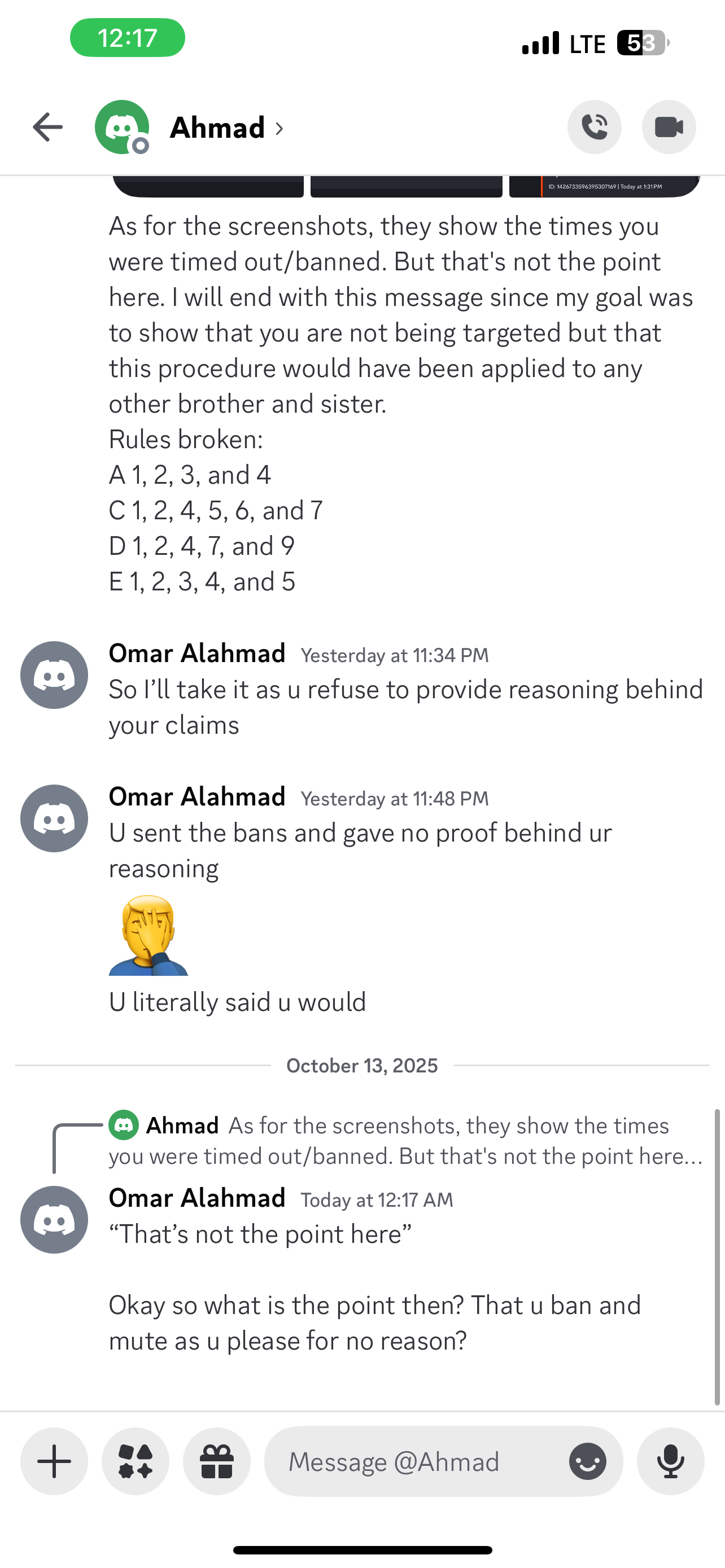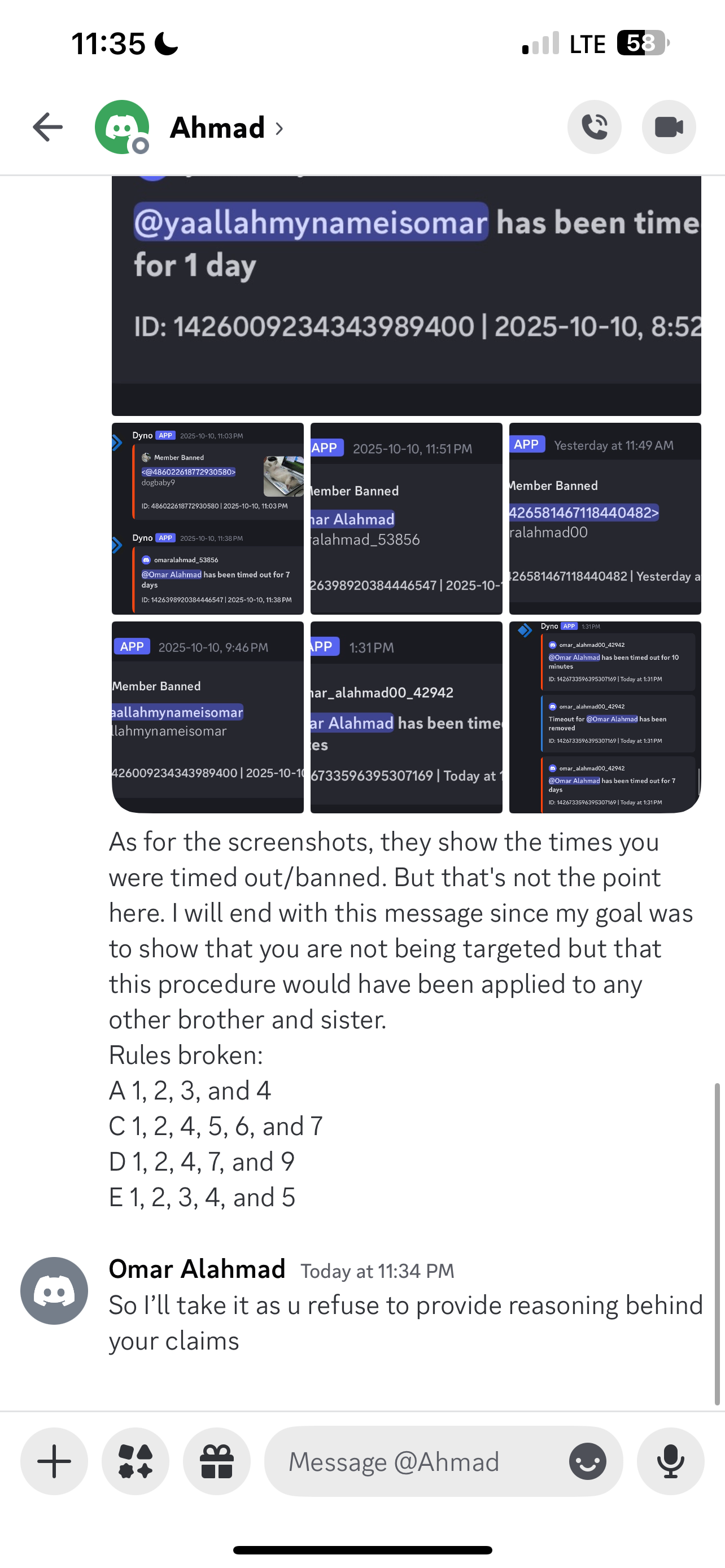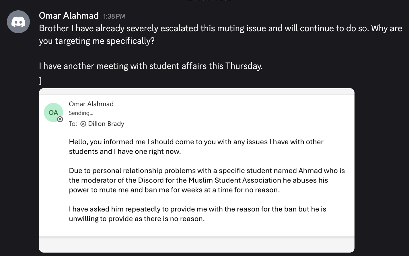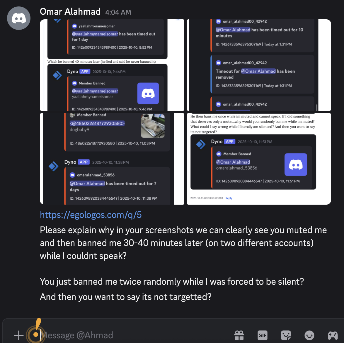 If I like to resolve this between us, of course, I don’t want the university to be involved. If you want to involve the university, I don’t mind. I can show them screenshots of what happened, how this is against the rules of the server, how you were timed out for that reason, and how your second and third accounts were banned. But if you want to keep it between us, that’s what I prefer. I am ready to talk in person, which I prefer because we understand each other better in person. On text, meanings can be misunderstood. In person is better. If you want to meet with a third person to moderate, or bring in the university person you emailed, we can do that. That’s not an issue. Whatever is best for you. It’s midterm season but I can always free half an hour.