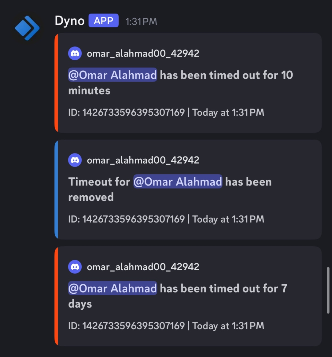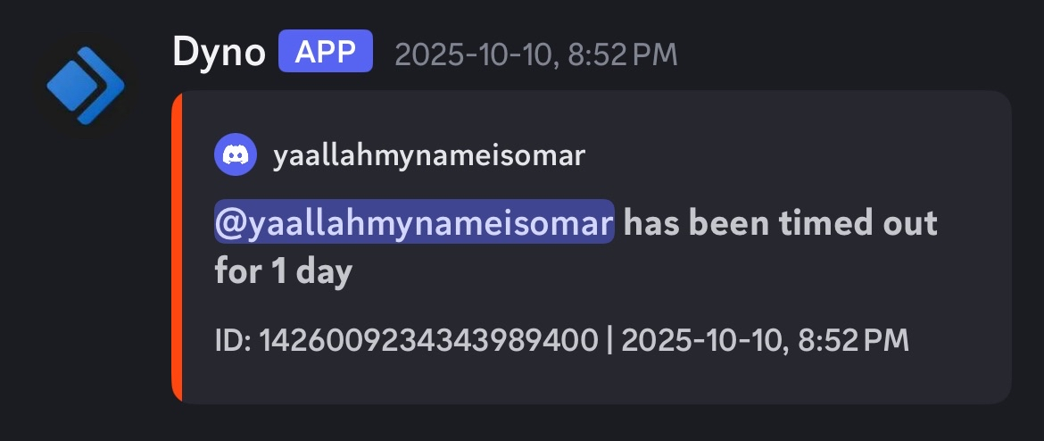 You kept complaining; you kept wanting to argue, so I had to time you out. About the timeouts and the bans, we ban the alt account when someone makes another to continue talking. That’s the rule. So yes, we banned your second account but only timed out the first. If you see that it’s banned, I can look into it. In my case, I did not ban your original account; I only banned the second one.